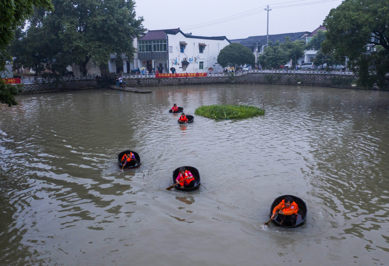 Des villageois participent à une compétition d'aviron de seau au village de Quanxin de la ville de Huzhou, dans la province chinoise du Zhejiang (est), le 23 juin 2020