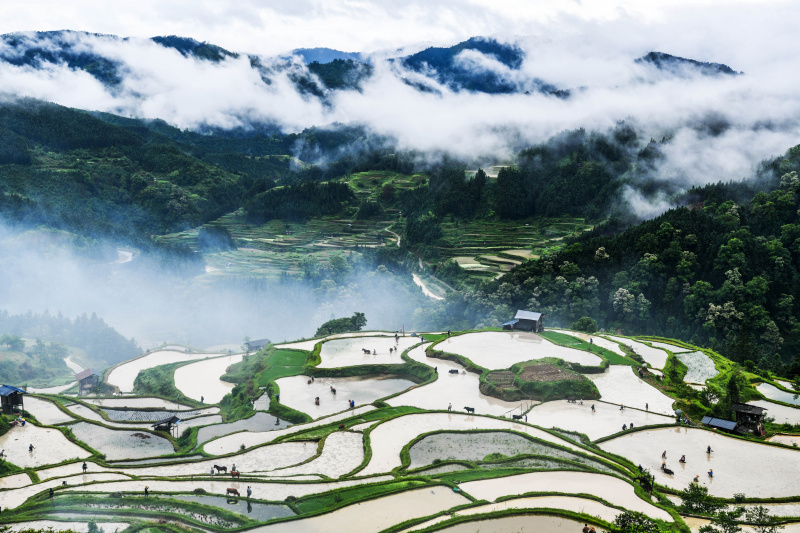 Des agriculteurs et du bétail travaillent dans les champs en terrasse lors doeun événement présentant les traditions agricoles locales dans le district de Liping de la préfecture autonome Miao et Dong de Qiandongnan, dans la province chinoise du Guizhou (sud-ouest), le 23 mai 2021. - Photo : Yang Wenb