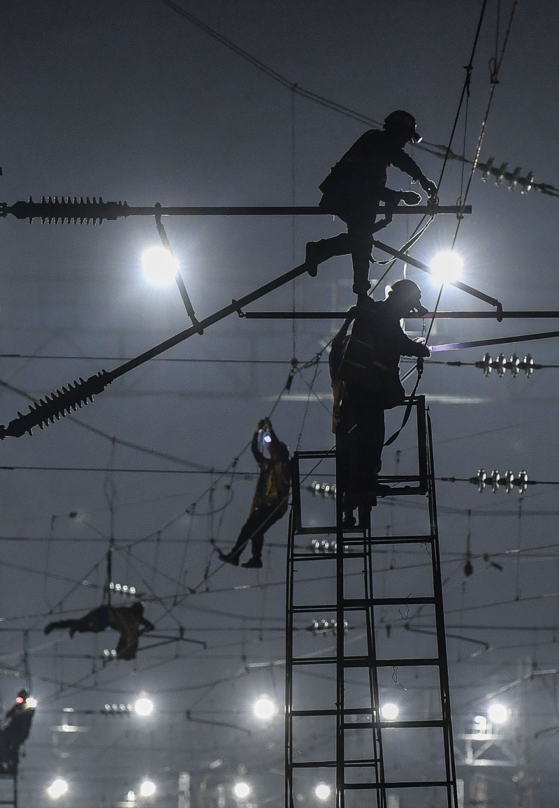 Des constructeurs ferroviaires travaillent toute la nuit pour effectuer des améliorations ferroviaires, qui devraient rendre le transport de passagers et de marchandises dans la région de la Grande Baie Guangdong-Hong Kong-Macao plus efficace, près de la gare de Jiangcun à Guangzhou, dans la province chinoise du Guangdong (sud), le 29 mai 2020. - Photo : Liu Daw