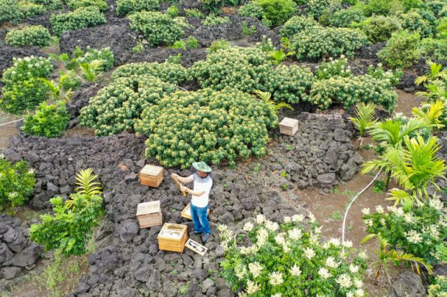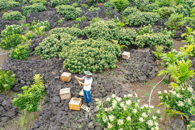 Photo aérienne prise le 7 mars 2021 montrant un apiculteur examinant une ruche au milieu de fleurs de litchi dans le bourg de Yongxing de la ville de Haikou, dans la province chinoise de Hainan