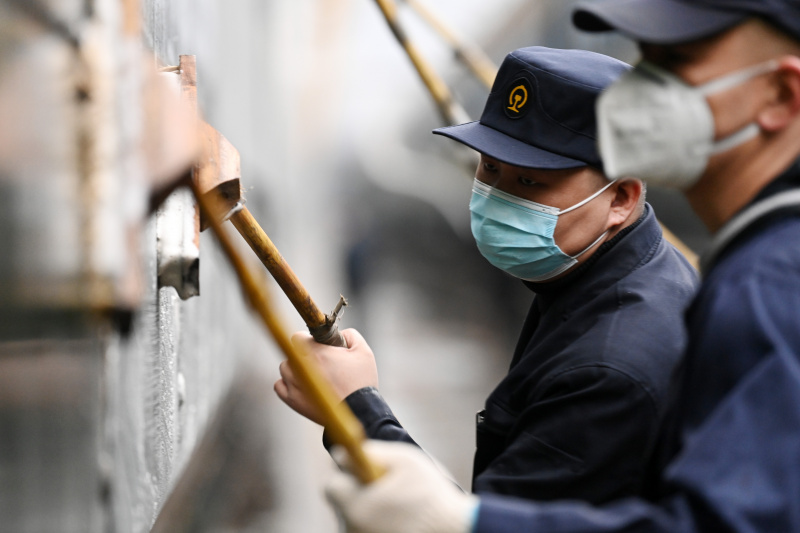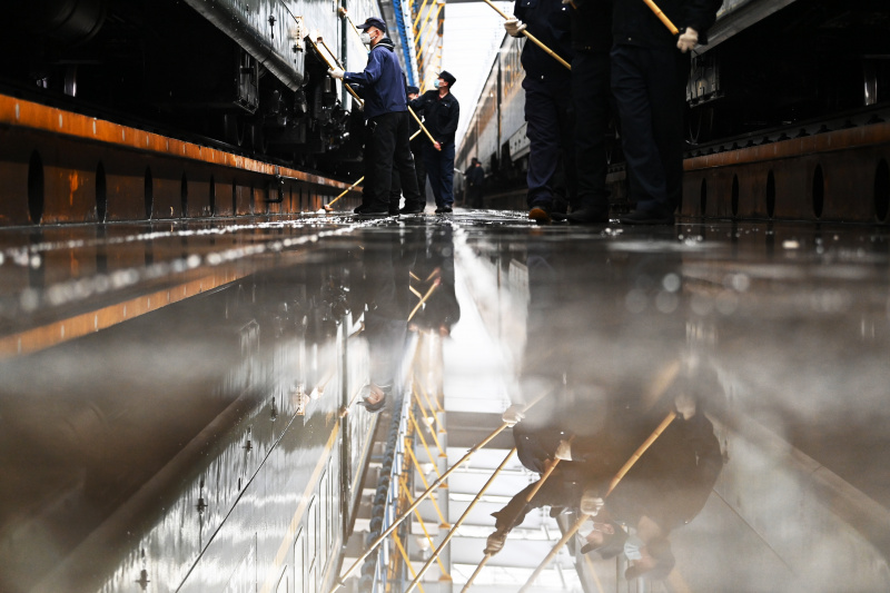 Z237/8 dans un garage de service de la China Railway Harbin Bureau Group Co., Ltd.à Harbin, dans la province chinoise du Heilongjiang (nord-est), le 1er février 2021. Ce garage de service, nommé "bain de train", est un endroit où les locomotives et les wagons sont nettoyés en profondeur. Des dizaines d'employés y travaillent chaque jour munis de leurs brosses et de leurs tuyaux d'arrosage pour que les véhicules puissent accueillir les passagers avec un nouveau look le lendemain. - Photo : Wang Jianw.