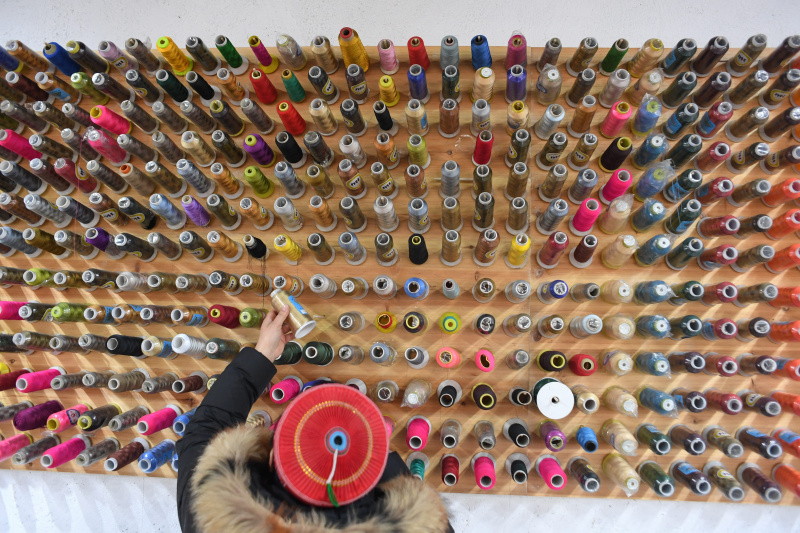 Une femme contrôle la qualité des oeuvres de broderie dans un atelier de Shibing, district de la préfecture autonome Miao et Dong de Qiandongnan, au Guizhou, dans le sud-ouest de la Chine, le 21 janvier 2021