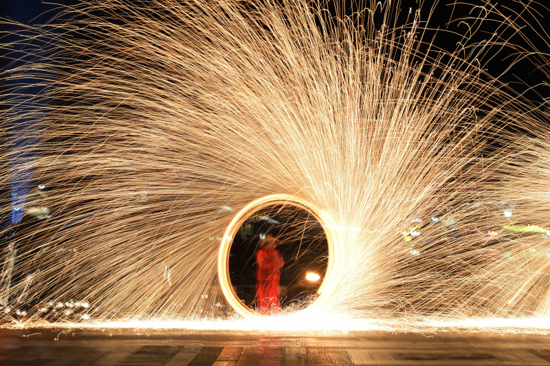 Des gens admirent des "fleurs de fer", un spectacle d'art folklorique qui consiste à lancer du fer fondu pour créer des effets de feu d'artifice, à Changsha, capitale de la province chinoise du Hunan (centre), le 26 février 2021