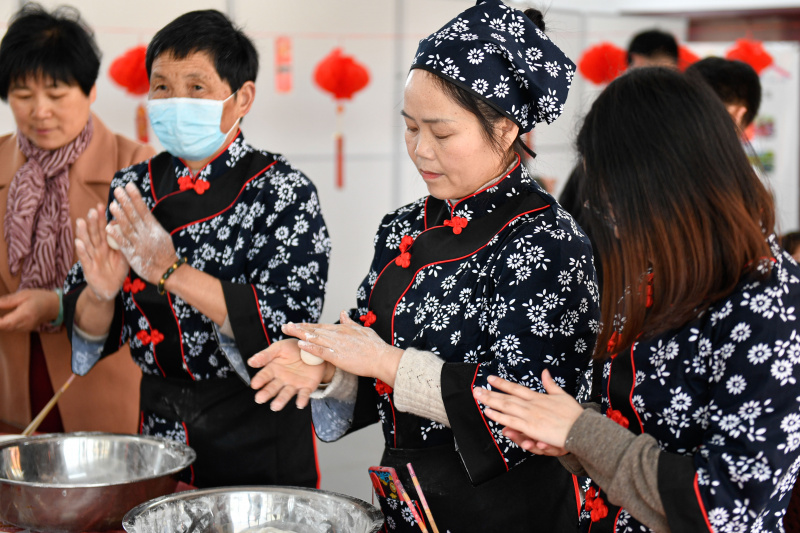 Des habitantes font des tangyuans, sorte de boulettes sucrées à base de farine de riz glutineux, dans le bourg de Miaoxi de la ville de Huzhou, dans la province chinoise du Zhejiang (est), le 23 février 2021