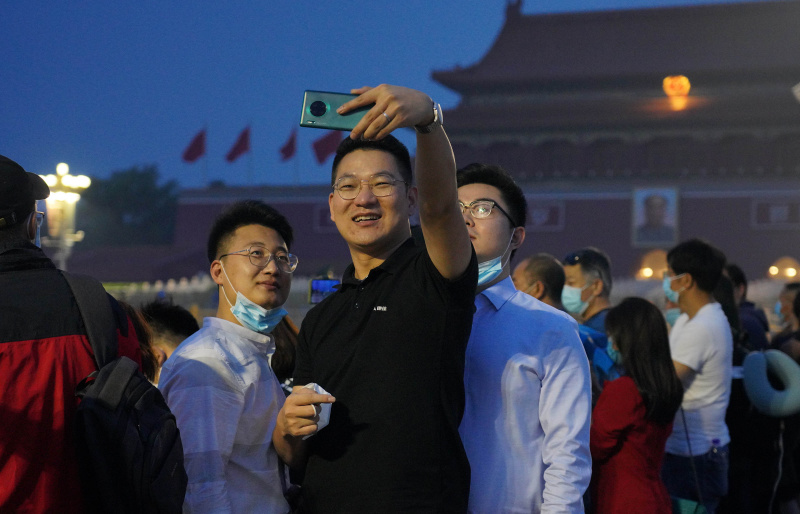 Des gens prennent un selfie avant la cérémonie de lever du drapeau national sur la place Tian'anmen, à Beijing, capitale chinoise, le 21 mai 2020