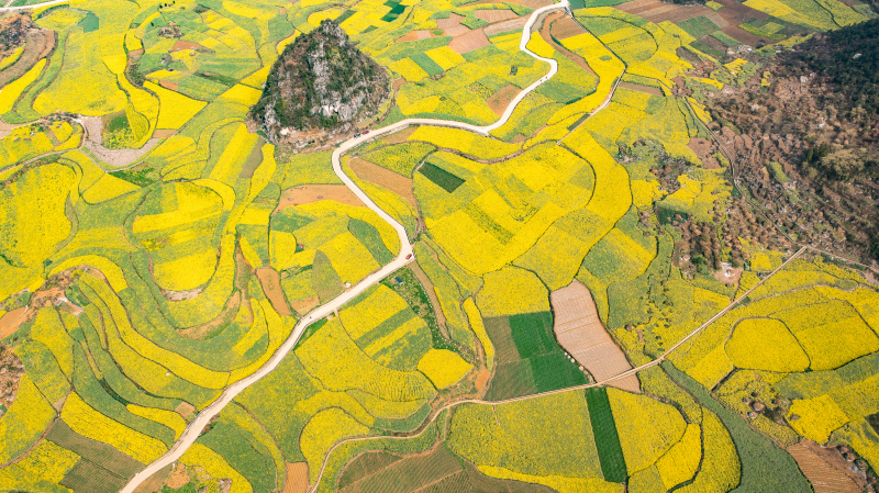 Photo aérienne d'un drone des champs de fleurs de colza, dans le village de Dibo de l'arrondissement spécial de Liuzhi, à Liupanshui, dans la province chinoise du Guizhou (sud-ouest), le 12 mars 2024