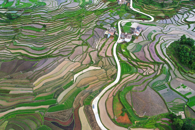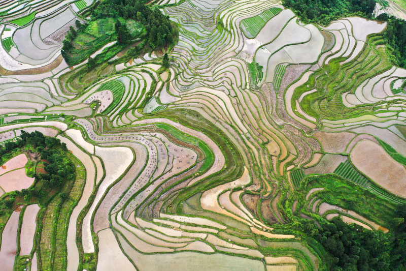Photo aérienne panoramique de champs en terrasse de Lali, dans le village de Shiban du bourg de Yanshan du district de Guiding, dans la province chinoise du Guizhou (sud-ouest), le 1er juin 2022. - Photo : Yang Wenb