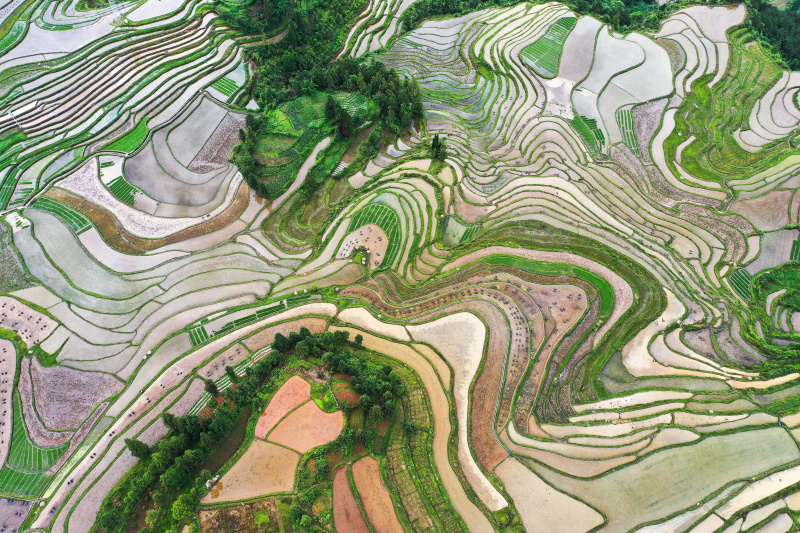 Photo aérienne de champs en terrasse de Lali, dans le village de Shiban du bourg de Yanshan du district de Guiding, dans la province chinoise du Guizhou (sud-ouest), le 1er juin 2022