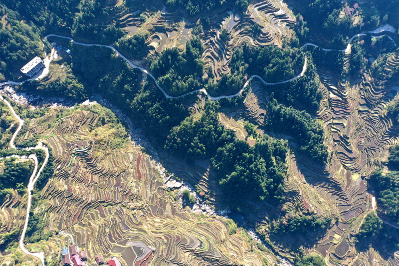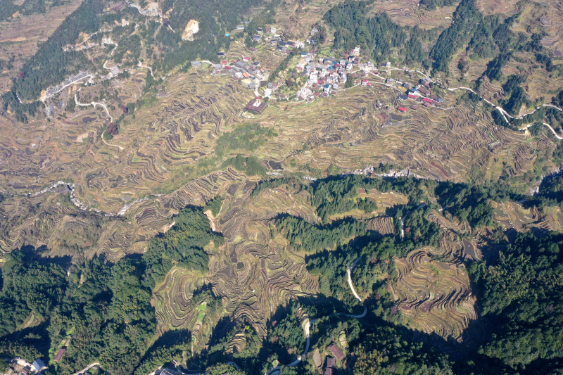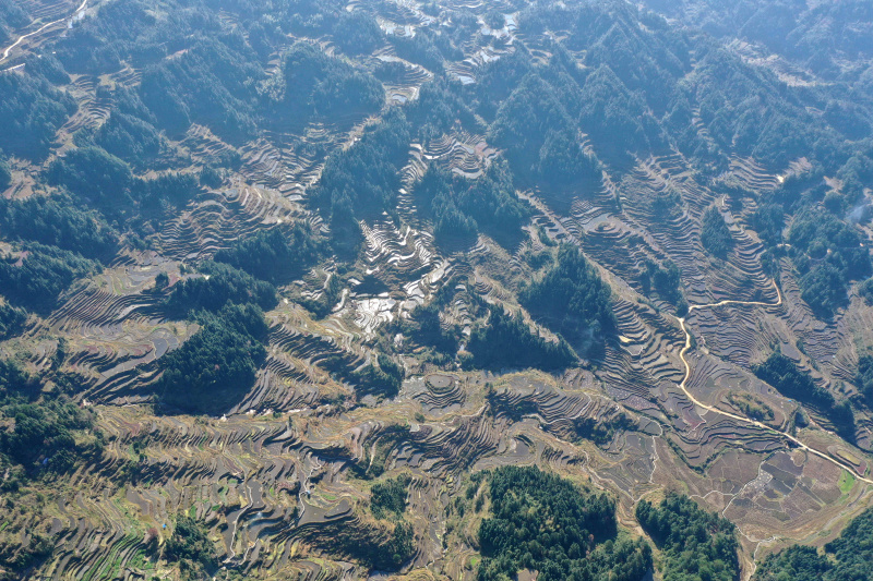 Des champs en terrasses au bourg d'Antai du district Miao de Rongshui, dans la région autonome Zhuang du Guangxi (sud), le 7 décembre 2021. - Photo : Huang Xiaoba