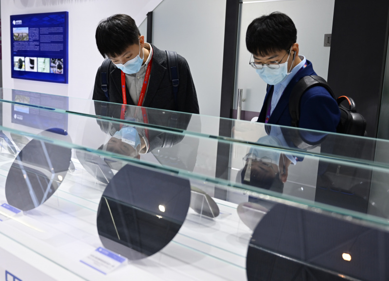 Des visiteurs regardent des produits exposés lors de la Conférence mondiale sur les circuits intégrés 2022 à Hefei, dans la province chinoise de l'Anhui, le 17 novembre 2022