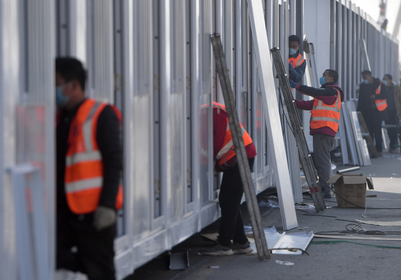 Des ouvriers travaillent sur le chantier d'un centre de quarantaine temporaire à Yuzhou, ville de la province chinoise du Henan (centre), le 14 janvier 2022