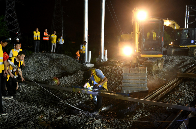 Des ouvriers travaillent sur un chantier de construction du chemin de fer à grande vitesse Hefei-Anqing dans la province orientale de l'Anhui, aux petites heures du matin, le 25 août 2020