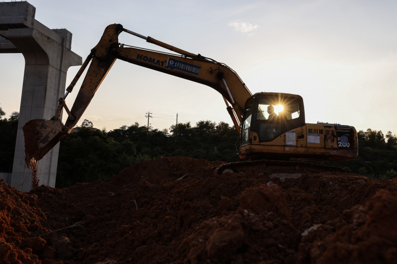 Photo aérienne du chantier d'un chemin de fer à sustentation magnétique (maglev) à vitesse modérée-faible près du parc d'attractions Chimelong, dans la ville de Qingyuan de la province chinoise du Guangdong (sud), le 9 août 2020