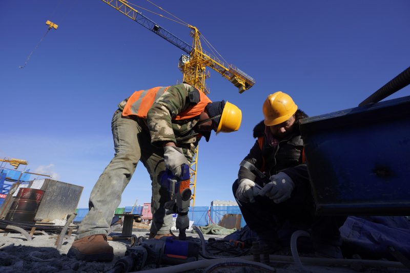 Deux ouvriers travaillent dans le chantier de construction de la section de Sanhe du chemin de fer interurbain Beijing-Tangshan, dans la ville de Langfang, de la province du Hebei (nord), le 30 novembre 2020