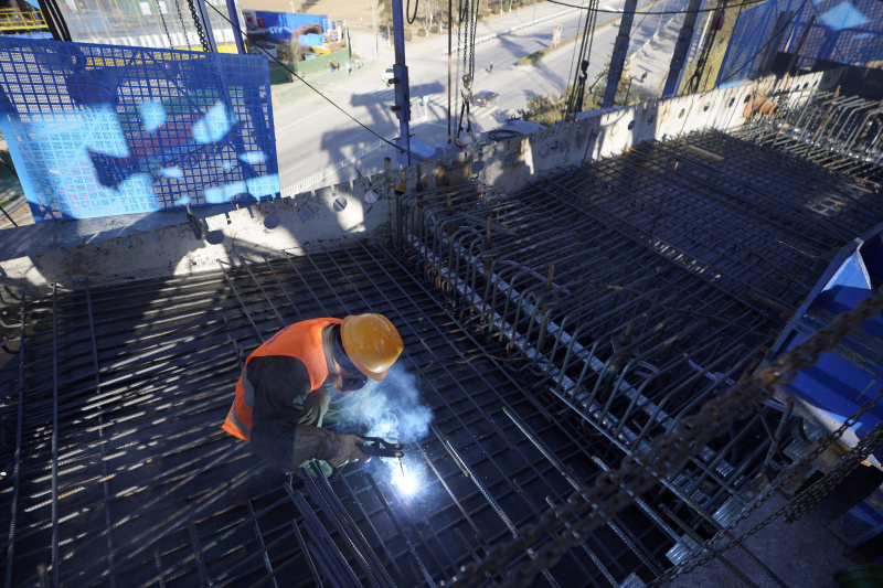 Un ouvrier travaille dans le chantier de construction de la section de Sanhe du Chemin de fer interurbain Beijing-Tangshan, dans la ville de Langfang, de la province du Hebei (nord), le 30 novembre 2020