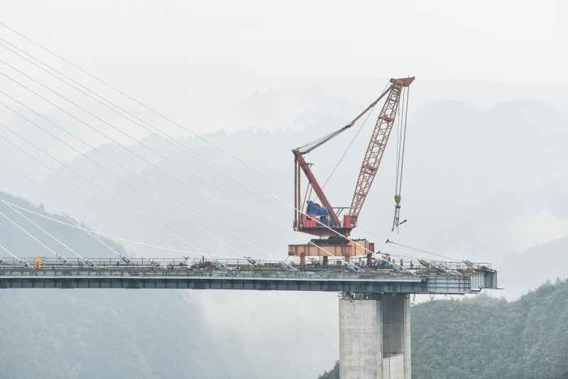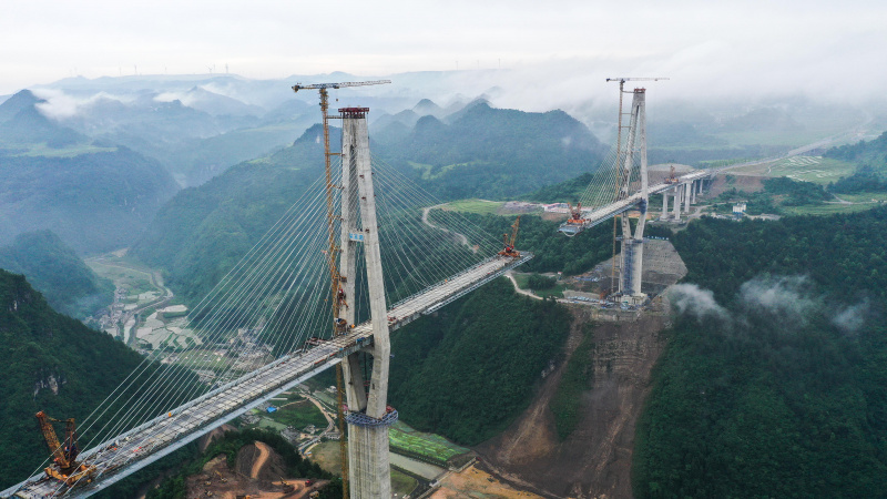 Photo prise le 14 juin 2022 montrant le chantier du grand pont de Duohua, dans le district de Longli, dans la province chinoise du Guizhou (sud-ouest)