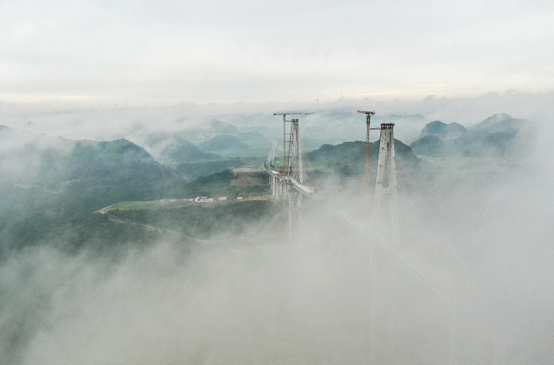 Photo aérienne prise le 14 juin 2022 montrant le chantier du grand pont de Duohua, dans le district de Longli, dans la province chinoise du Guizhou (sud-ouest). - Photo : Yang Wenb