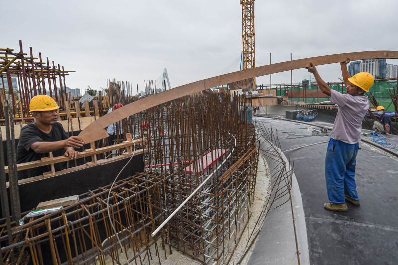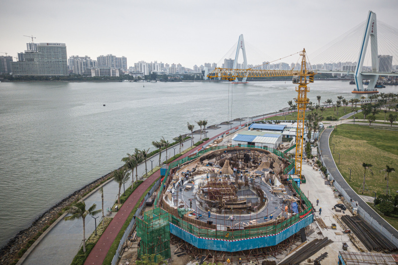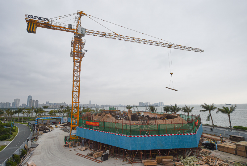 Des ouvriers travaillent dans le site de construction de la Bibliothèque Wormwhole dans la baie de Haikou, à Haikou, capitale de la province chinoise de Hainan (sud), le 20 octobre 2020
