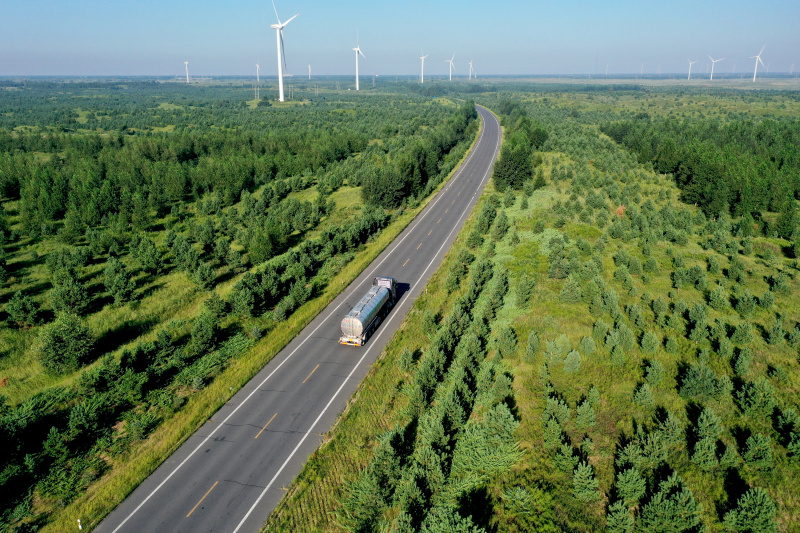 Photo aérienne prise le 16 août 2022 montrant un camion roulant sur une route entourée de forêts à Horqin, de la ville de Tongliao, dans la région autonome de Mongolie intérieure (nord)