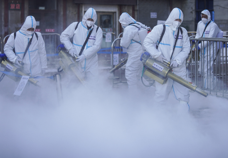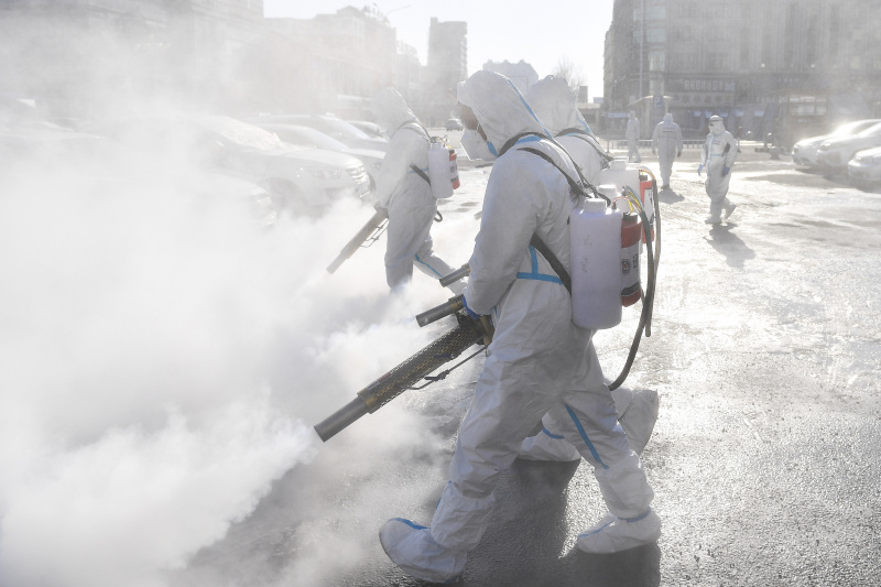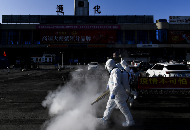 Un employé désinfecte la place de la gare de Tonghua, ville de la province chinoise du Jilin (nord-est), le 9 février 2021. - Photo : Xu Cha