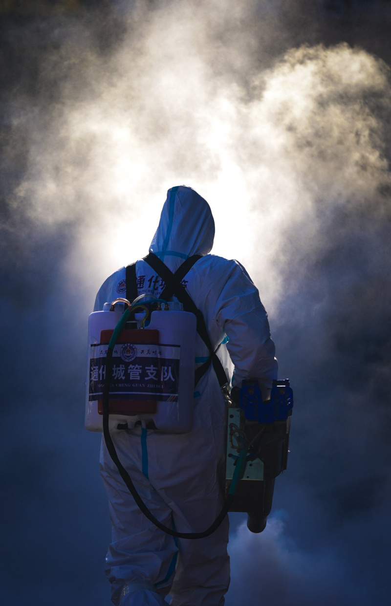 (miniature) Un employé désinfecte la place de la gare de Tonghua Un employé désinfecte la place de la gare de Tonghua