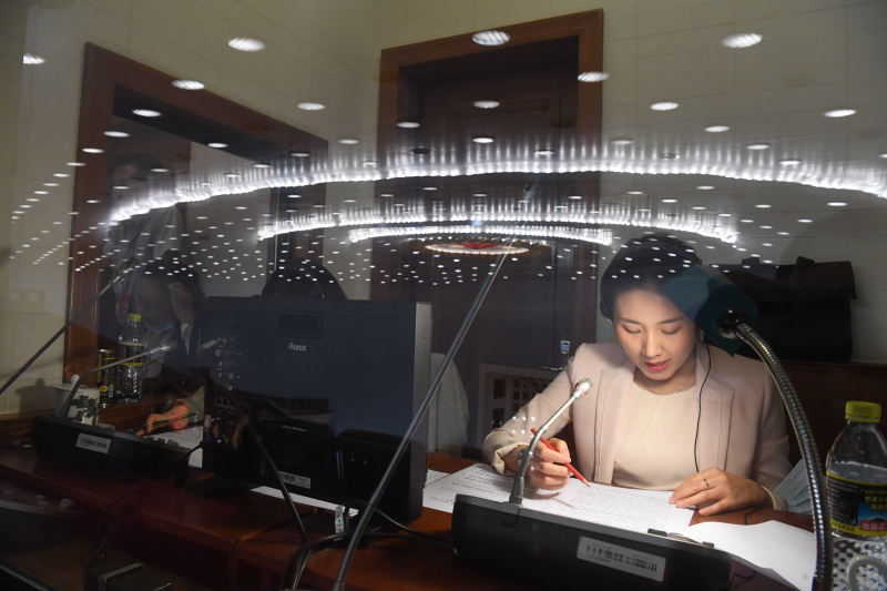 Une interprète travaille lors de la deuxième réunion plénière de la troisième session de la 13e Assemblée populaire nationale (APN), au Grand Palais du Peuple, à Beijing, capitale chinoise, le 25 mai 2020