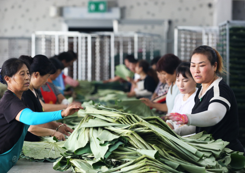 Des villageoises manipulent des feuilles de lotus dans un atelier du bourg de Linhuai, dans le district de Sihong de la province chinoise du Jiangsu (est), le 14 juillet 2021