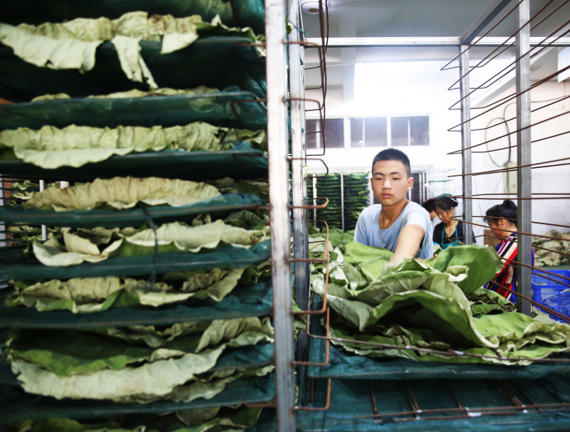 Des employés manipulent des feuilles de lotus dans un atelier du bourg de Linhuai, dans le district de Sihong de la province chinoise du Jiangsu (est), le 14 juillet 2021