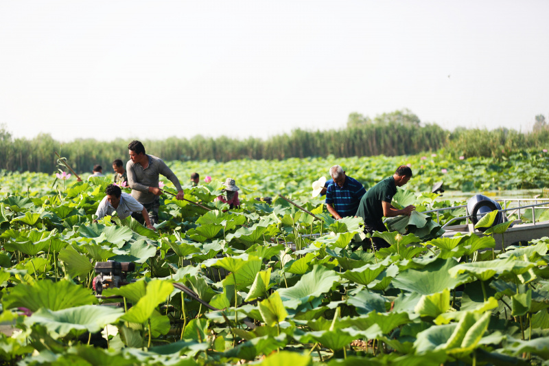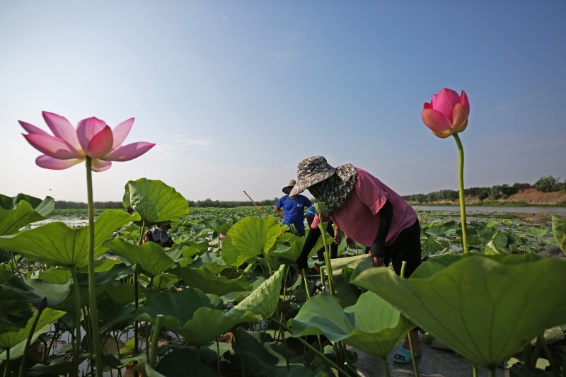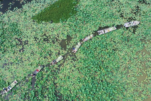 Des villageois cueillent des feuilles de lotus dans le lac Hongze, dans le district de Sihong de la province chinoise du Jiangsu (est), le 14 juillet 2021. - Photo : Xu Changlia