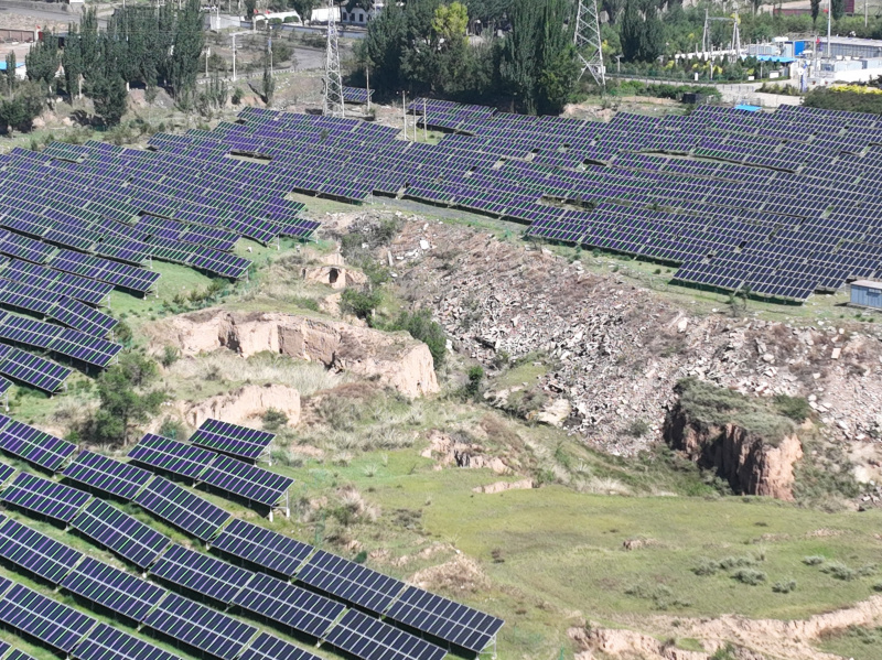 Vue aérienne d'un drone montrant des panneaux photovoltaïques dans la base nationale de démonstration photovoltaïque des technologies avancées de la zone d'affaissement de l'exploitation minière de Datong, dans la province chinoise du Shanxi (nord), le 30 mai 2024. - Photo : Liu Liha