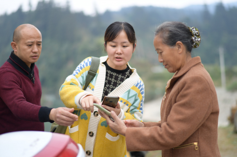 Une employée (au centre) montre à une villageoise comment payer sa facture de téléphone portable dans le village de Balu, dans le bourg de Pingjiang du district de Rongjiang, dans la province du Guizhou (sud-ouest de la Chine), le 16 novembre 2020