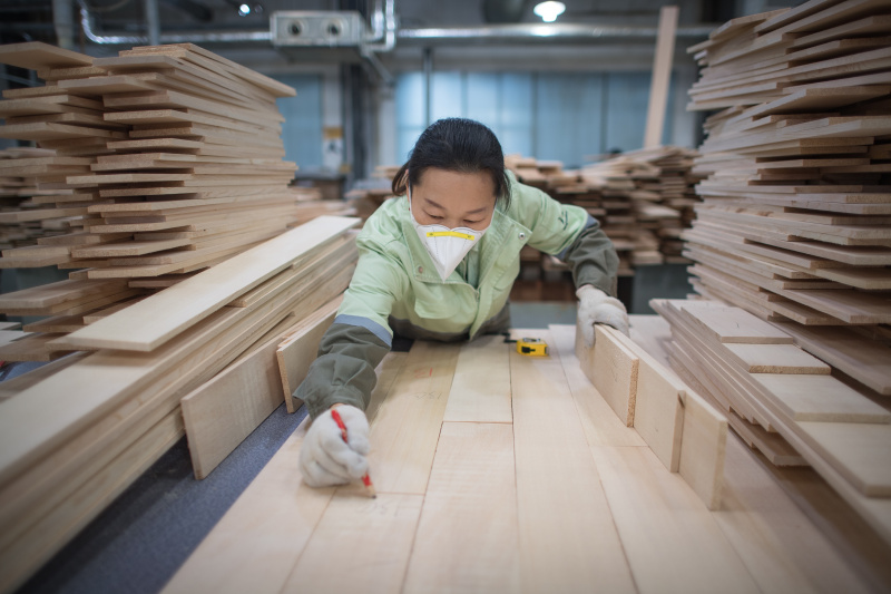 Un ouvrier dans une fabrique de pianos de Parsons Music Corporation, à Yichang, dans la province chinoise du Hubei (centre), le 23 novembre 2021