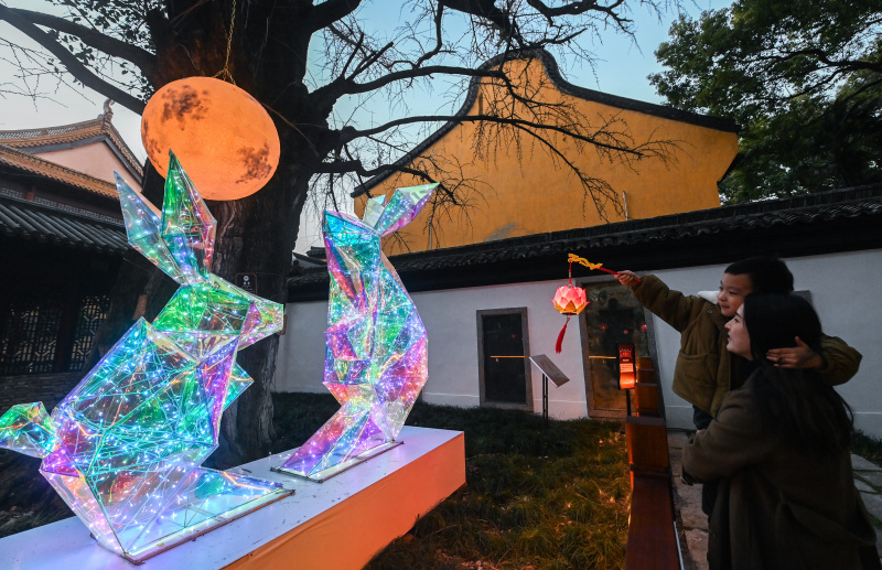 Des visiteurs admirent des lanternes en forme de lapins lors du Festival des lanternes d'Aoshan, dans l'ancien bourg de Xincheng de l'arrondissement de Xiuzhou, à Jiaxing, dans la province chinoise du Zhejiang (est), le 29 janvier 2023