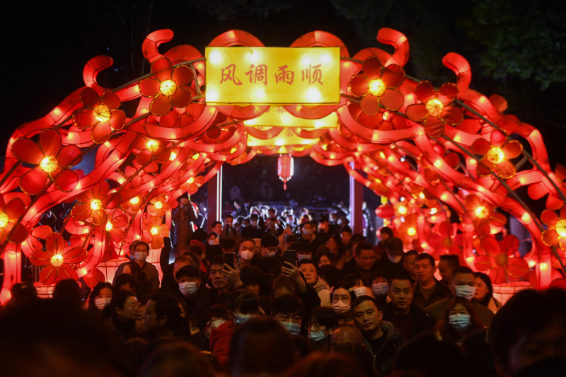Des visiteurs admirent des lanternes lors du Festival des lanternes d'Aoshan, dans l'ancien bourg de Xincheng de l'arrondissement de Xiuzhou, à Jiaxing, dans la province chinoise du Zhejiang (est), le 29 janvier 2023