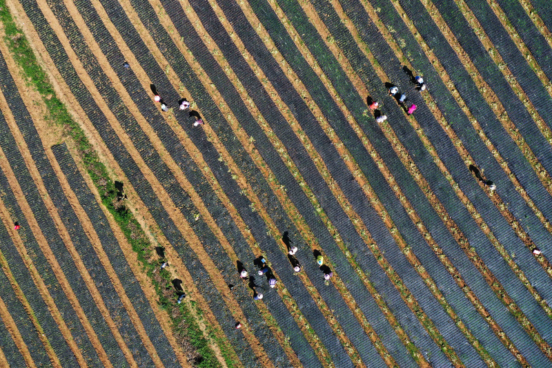 Photo aérienne de champs de légumes dans le district autonome Yi, Hui et Miao de Weining, dans la province chinoise de Guizhou (sud-ouest), le 17 juin 2020
