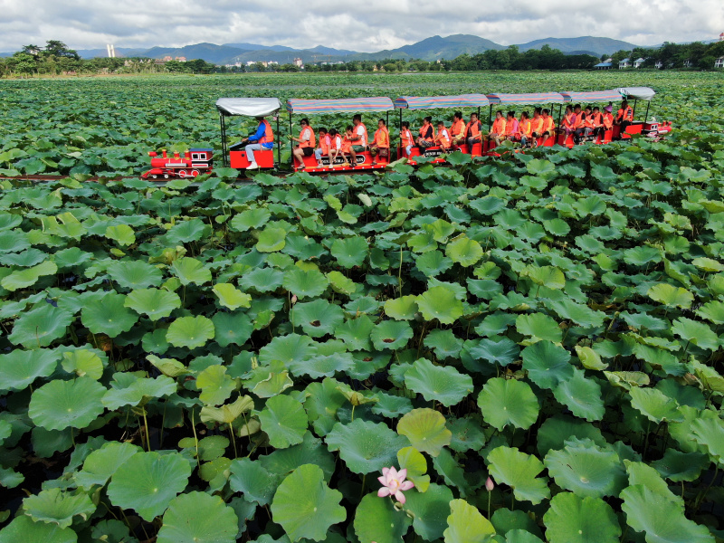 Des visiteurs prennent un mini-train touristique pour admirer des fleurs de lotus sur le lac Longde, dans la ville de Jinghong de la préfecture autonome Dai de Xishuangbanna, dans la province chinoise du Yunnan (sud-ouest), le 2 juillet 2022. - Photo : Li Yunshe