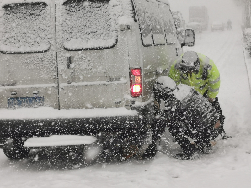 Un policier aide un conducteur sous une forte chute de neige à Dalian, dans la province chinoise du Liaoning (nord-est), le 6 janvier 2021
