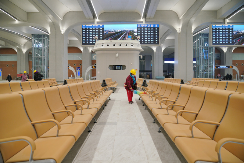 Un ouvrier nettoie les chaises d'une salle d'attente de la gare de Xiongan, sur la ligne ferroviaire Beijing-Xiongan, dans la nouvelle zone de Xiongan, au Hebei, province du nord de la Chine, le 23 décembre 2020