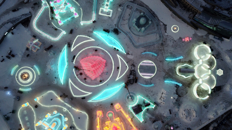 Photo aérienne prise le 23 décembre 2021 du chantier d'Harbin Ice-Snow World, à Harbin, dans la province chinoise du Heilongjiang (nord-est)