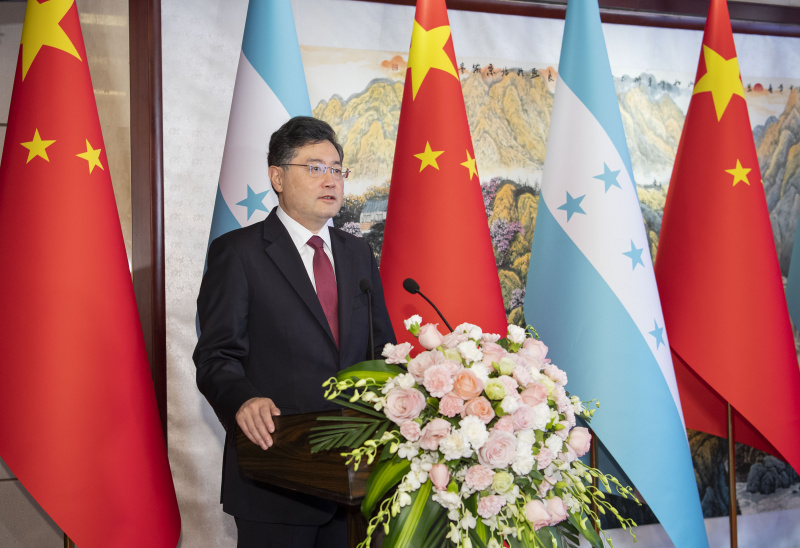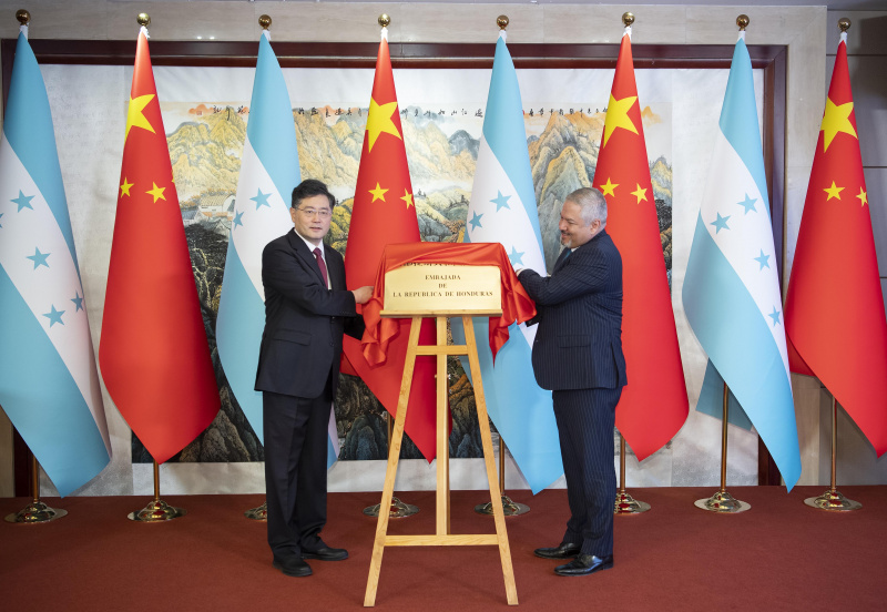 Le conseiller d'Etat et ministre des Affaires étrangères de la Chine, Qin Gang, a assisté dimanche à la cérémonie d'inauguration de l'ambassade de la République du Honduras, à Beijing, avec le ministre hondurien des Affaires étrangères, Enrique Reina, actuellement en visite dans le pays.