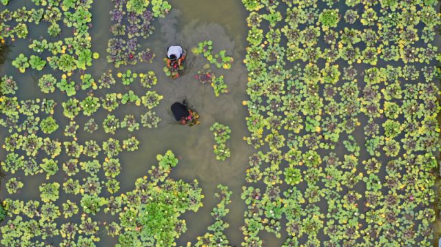 Des villageois s'occupent des fleurs de lotus dans une serre du village de Caotangtuo de la ville de Luanzhou, dans la province septentrionale du Hebei, le 12 août 2020