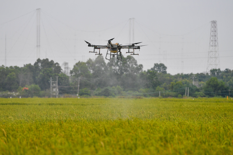 Un drone pulvérise des pesticides dans un champ de production de semences dans la ville de Dongfang, de la province chinoise de Hainan (sud), le 15 octobre 2022