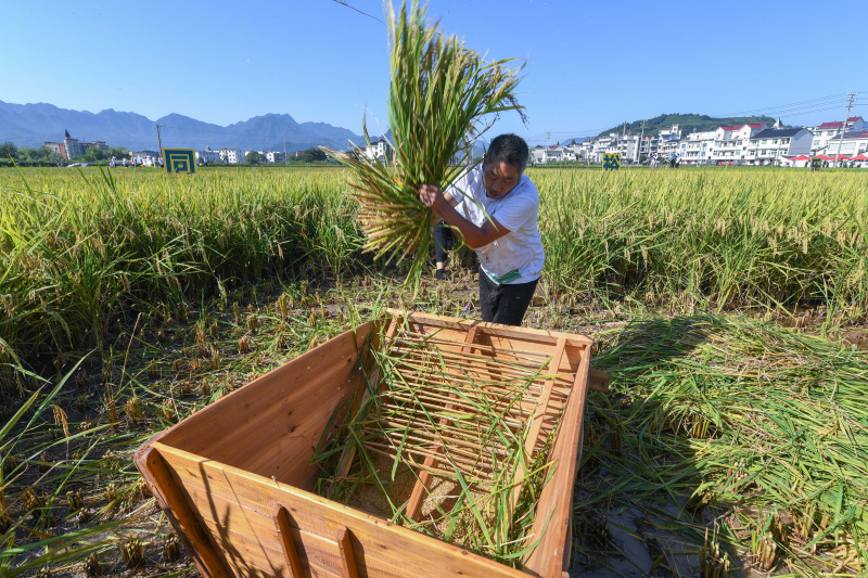 Un agriculteur participe à un jeu de récolte du riz dans le bourg de Datong de Jiande, dans la province chinois du Zhejiang (est), le 22 septembre 2021