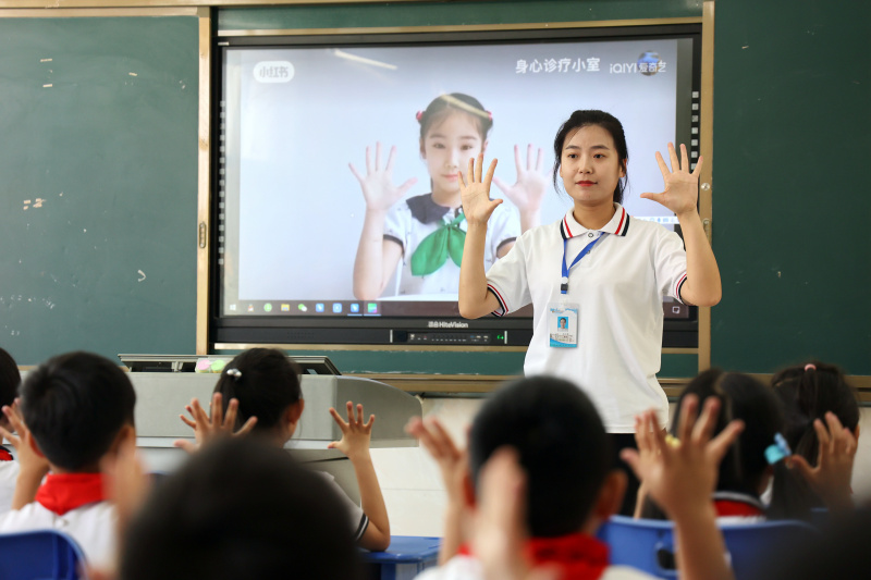 Une enseignante montre à des élèves comment faire des exercices oculaires dans une école à Binzhou, dans la province chinoise du Shandong (est), le 5 juin 2023