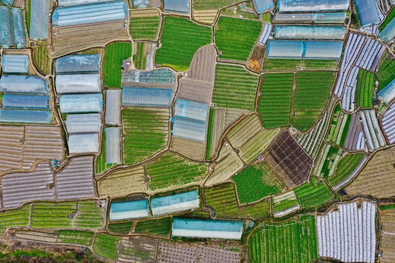 Vue aérienne d'une base de plantation de légumes dans le bourg de Jingxi, dans le district de Minhou, à Fuzhou, capitale de la province chinoise du Fujian (sud-est), le 25 février 2023