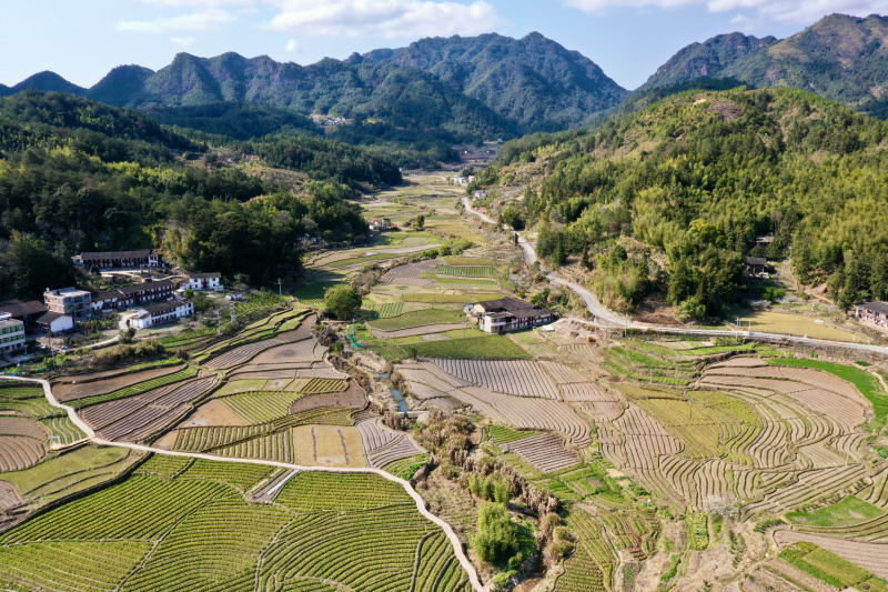 Vue aérienne de terres agricoles dans le bourg de Baiyun, dans le district de Yongtai, à Fuzhou, capitale de la province chinoise du Fujian (sud-est), le 23 février 2023
