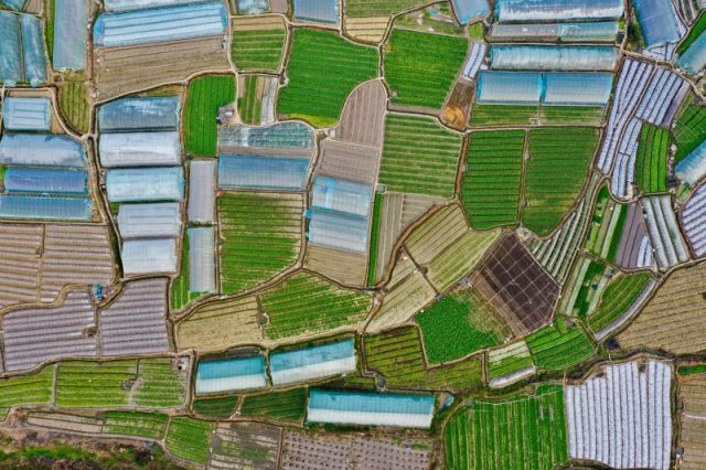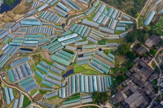 Vue aérienne d'une base de plantation de légumes dans le bourg de Nantong, dans le district de Minhou, à Fuzhou, capitale de la province chinoise du Fujian (sud-est), le 26 février 2023