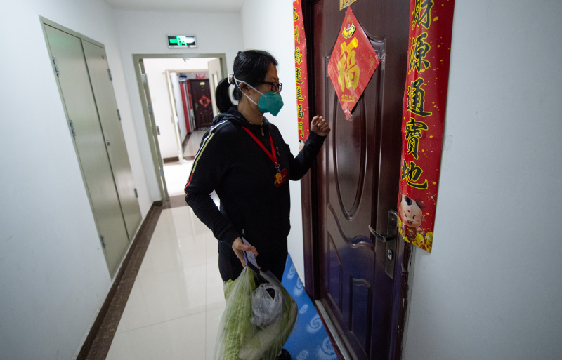 Une travailleuse de quartier livre des légumes à une personne âgée dans un quartier résidentiel de l'arrondissement de Haidian, à Beijing, le 28 avril 2022