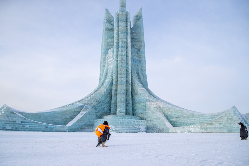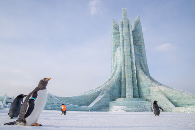 Des manchots venant du Parc polaire de Harbin dans le Monde de glace et de neige de Harbin, célèbre parc d'attractions saisonnier qui ouvre chaque hiver, à Harbin, dans la province chinoise du Heilongjiang (nord-est), le 17 décembre 2022. - Photo : Zhang T