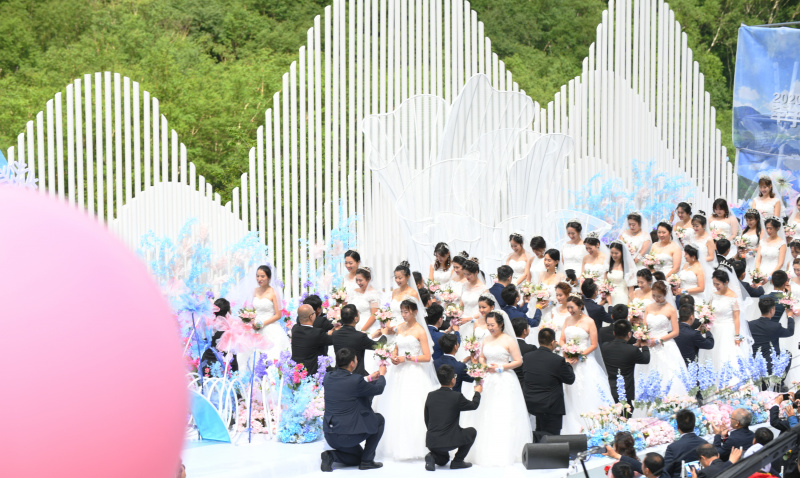 Des couples ayant participé à la lutte contre le COVID-19 prennent part à un mariage de groupe organisé par le comité de gestion du mont Changbai, dans la province chinoise du Jilin (nord-est), le 8 juillet 2020